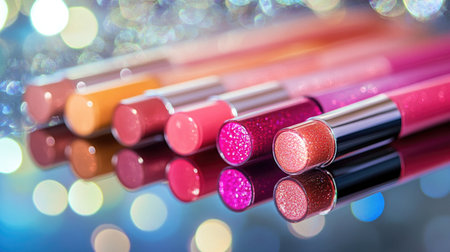 A stunning arrangement of vibrant lip glosses showcasing various shades on a sparkling background. Perfect for beauty and cosmetic themes.