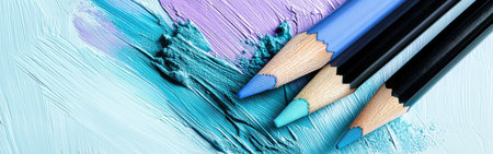 A stunning display of makeup pencils in soft colors arranged beside a shimmering loose powder on a cream background, ideal for beauty and art themes.