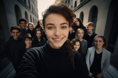 Global smiles: capturing joy in group selfies of cheerful and happy young people diverse nationalities, celebrating unity, friendship, cultural harmony in shared moments of happiness and togetherness