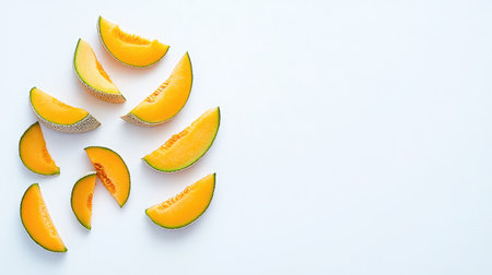 Colorful slices of ripe melon scattered on a bright background create a fresh and appetizing feel, perfect for food styling, culinary inspirations, and seasonal recipes.