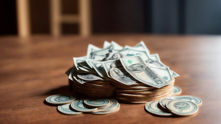 A stack of US dollars on a wooden table. The stack is so high that it almost reaches the table's edge. Concept of wealth and abundance, as the stack of money represents a significant amount of money