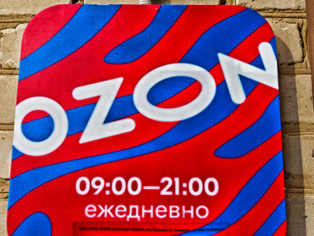 Kirov, Russia - October 29, 2025: A colorful sign shows store hours for an online marketplace that operates every day from nine AM to nine PM on a brick wall background.