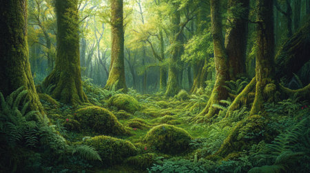 A mystical forest scene with a mossy path, ancient trees and sunlight filtering through the canopy.