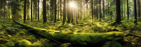 Panorama of a forest with sunlight coming through the trees and ferns