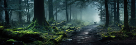 Mysterious forest in a misty day. Dark forest with fog