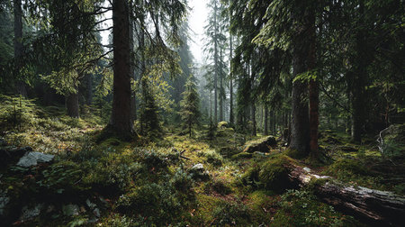 Healthy, green coniferous forest with old spruce, fir and pine trees in wilderness area of a national park. Sustainable industry, ecosystem and healthy environment concepts.