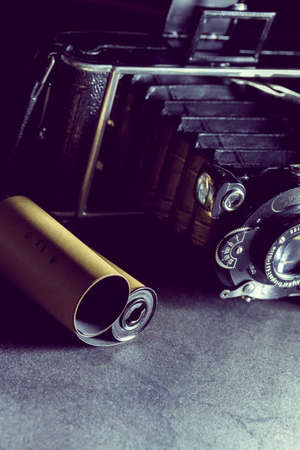 Old SLR film camera and a roll of film on black background, Photography Concept.