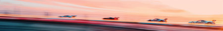 Coastal Speedway Circuit at Sunrise with Racing Cars in Motion.