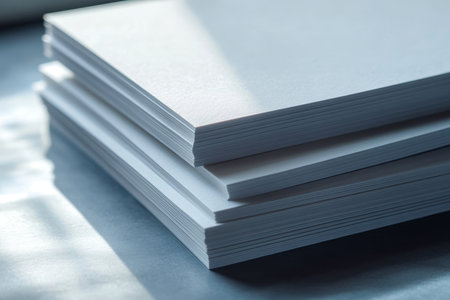 A visually striking arrangement of blank white paper sheets stacked neatly on a dark surface, showcasing the interplay of shadows and light, ideal for creative projects.