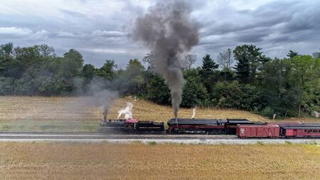 Strasburg, Pennsylvania, October 2019 - Aerial View of 2 Antique Norfolk and Western Steam Engines No. 611 and 382 Double Heading a Freight Train with Black Smoke and Steam Through Countryside