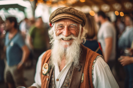 A man with a colorful hat and beard is wearing a multi-colored jacket. He has a serious expression on his face