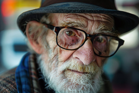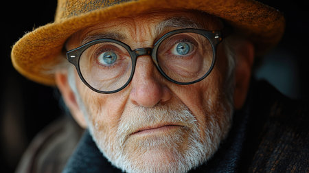 Elderly male with a hat and glasses is making a serious facial expression