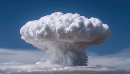 Dramatic mushroom cloud formation ascends into the sky, surrounded by soft clouds, illustrating the awe-inspiring beauty of natural atmospheric events