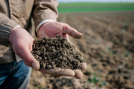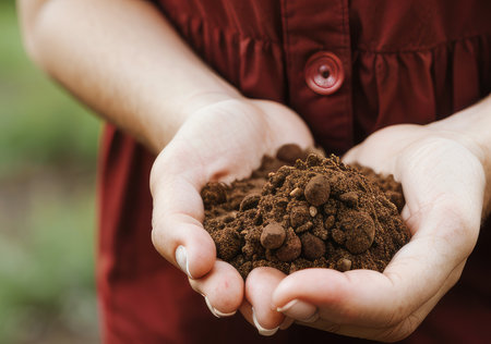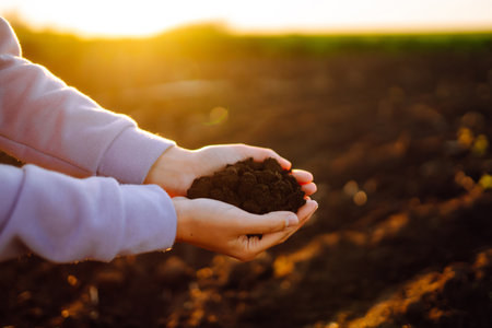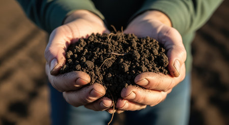 A farmer's hands cradle rich, dark soil, symbolizing the connection between human effort and agricultural growth in a natural setting.