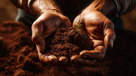 Hands holding dark soil, symbolizing connection to nature and earth. rich texture of soil conveys sense of nurturing and growth, evoking feelings of sustainability and environmental awareness
