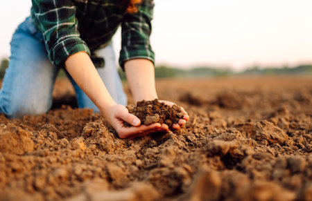 A close-up image showcasing hands spreading rich soil, symbolizing agricultural labor. Captures the essence of farming, nature, and sustainable practices in a serene setting.