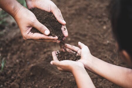 Close up with thin focus on little hand of young asian boy with black soil and dirty after gardening. Ecology and earth day concept