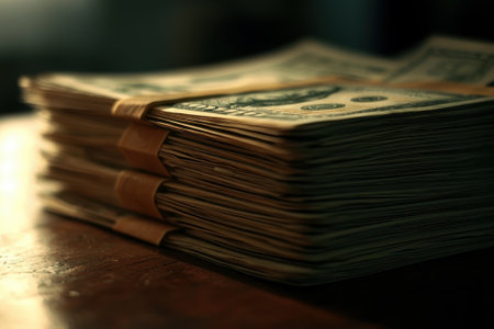 A neat stack of cash is bound with a silver ribbon, resting on a wooden table. Soft lighting enhances the texture of the bills, creating a focused atmosphere.