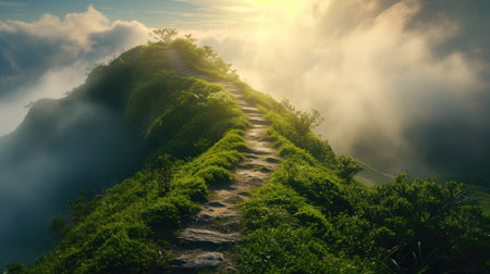 A serene and mystical scene of a narrow path leading up a green mountain, surrounded by clouds. The image evokes a sense of solitude and awe, capturing the majestic beauty of nature.