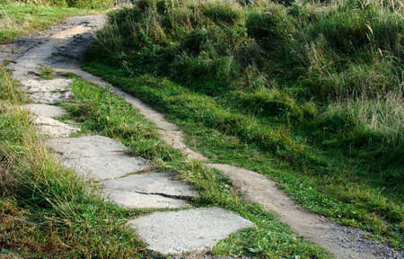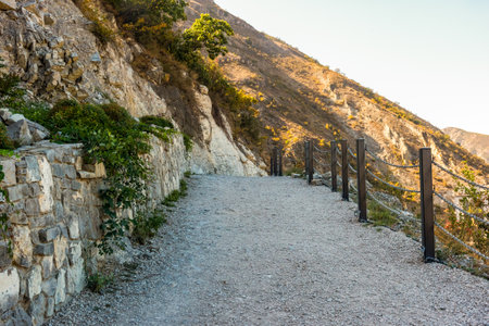Stone path in the mountains at sunset time. Landscape of mountain trail.