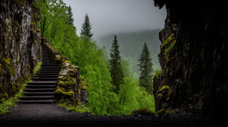 A serene forest path with wooden steps leading through misty woods, surrounded by dense greenery, creating a peaceful and mysterious atmosphere.