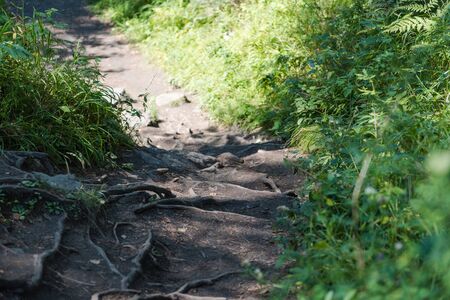 tree roots on paths in the forest. bare tree roots. road in the forest. fern. the sun, fold the trees. forest path