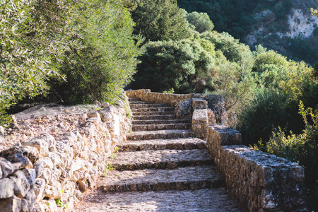 An upward view displays stone steps ascending a rocky hillside. The scene showcases rough-hewn stone steps, surrounded by green plants and large brown rocks under a bright blue sky. The image offers potential for visual storytelling, suitable for various editorial and commercial applications. The composition emphasizes natural textures and outdoor settings.
