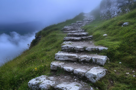 Serene Stone Step Path Gently Winds Up a Lush Verdant Hill Surrounded by Enchanting Fog and Nature