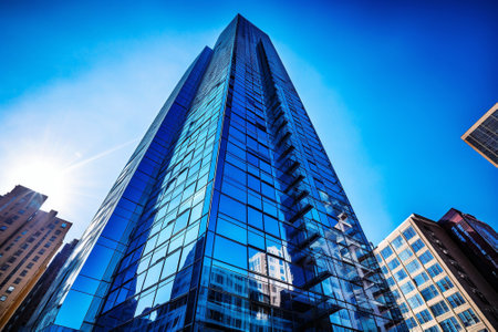 An upward perspective captures a contemporary skyscraper. The building features a glass facade reflecting the clear blue sky. This structure's composition showcases geometric patterns, highlighting the building's sleek design. Suitable for use in architecture, business, or urban development content, this imagery is adaptable for various commercial applications.