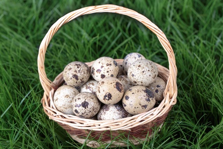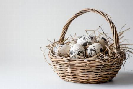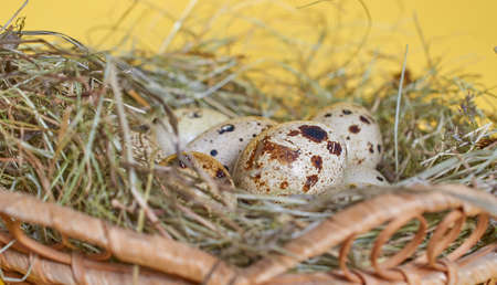 White basket full of quail eggs on bright yellow paper background with copy space, empty place for text. Easter holiday. greeting card. religious mockup design. Health food. farm product.