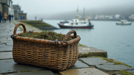 Wicker basket of seaweed on cobblestone wharf in foggy harbor.