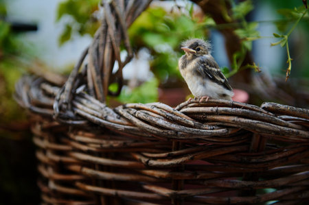 Cute baby bird sitting on wicker basket outdoors. Birds. Animals themes. Animals in wildlife