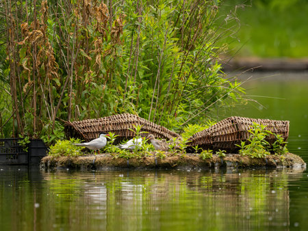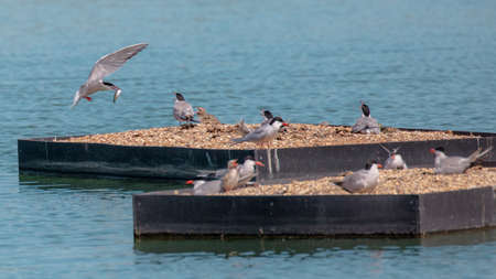 (Sterna hirundo) standing on a nest on a lake during the nesting season.