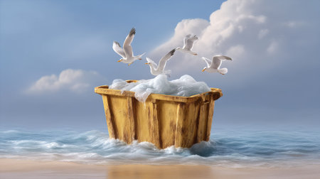 A wooden tub filled with bubbles floats in the tranquil ocean, surrounded by seagulls. This serene scene captures the essence of coastal life and relaxation.