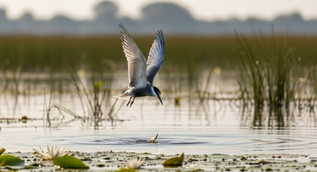A swift tern catching a fish from the surface of a tropical sea, wings outstretched