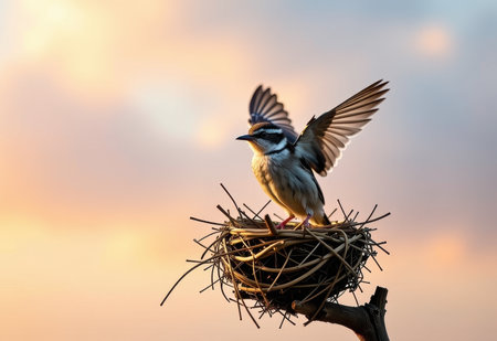 A baby bird perched on the edge of its nest, ready to take its first flight, symbolizing hope, new beginnings, and courage.