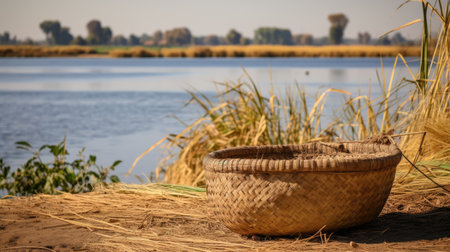 A beautifully crafted wicker basket floats serenely on the surface of calm water. The natural light enhances the texture, creating a tranquil scene.
