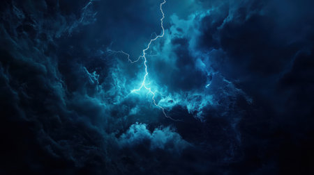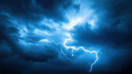 Captivating image of a lightning strike cutting through dark storm clouds, creating a stunning contrast of blue and white. A perfect representation of nature's power.