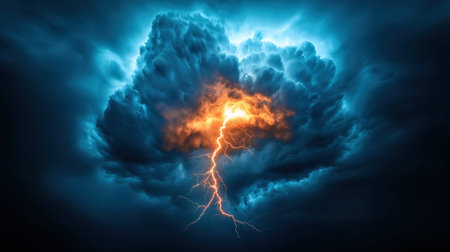 An impressive display of a lightning strike illuminating dark, turbulent clouds. The image features strong contrast and vivid color, dominated by shades of blue and orange. The dynamic composition and intense lighting suggest a powerful atmospheric event, suitable for various editorial and commercial applications.