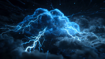 Dramatic storm cloud with vibrant blue lightning strikes, creating a powerful and visually striking image. Perfect for technology concepts.