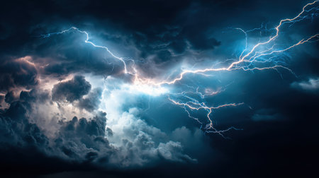 Captivating view of lightning bolts striking through dark clouds, creating an electrifying atmosphere in the night sky, highlighting nature's powerful beauty and intensity.