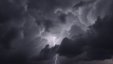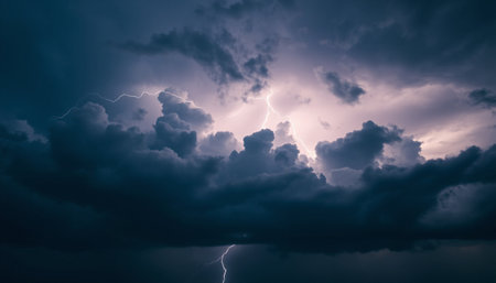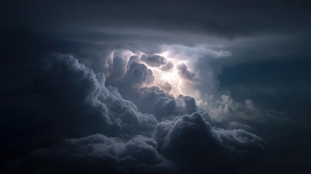 A stunning capture of dramatic thunderstorm clouds illuminated by bright lightning, showcasing the chaos and beauty of nature power at night.