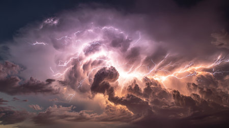 Captivating image of swirling thunderstorm clouds illuminated by intense lightning, showcasing nature's power and beauty in a twilight setting.