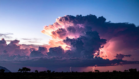 Majestic storm clouds illuminated by lightning create dramatic night sky filled with stars. scene captures beauty and power of nature, evoking sense of awe and wonder
