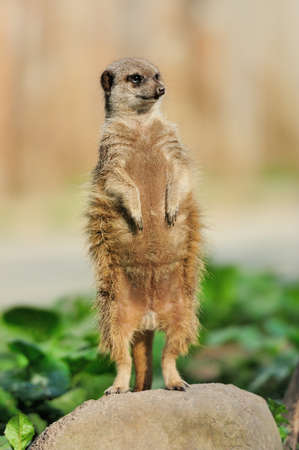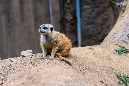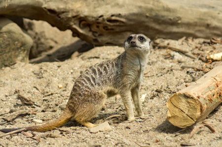 A meerkat - Suricata suricatta - stands upright on alert in a sunlit zoo enclosure. The animal watches attentively, showcasing natural behavior in a sandy habitat