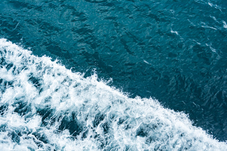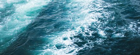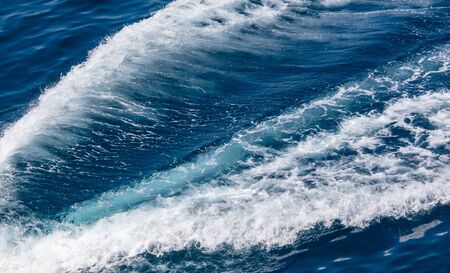 Turbulence made by foam of sea water from a high-speed yacht on surface of sea. Blue sea waves with lot of sea foam. Surface of sea with waves, splash, foam and bubbles, blue background and wallpaper.