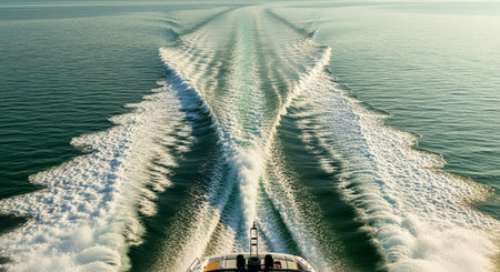 The powerful wake of a boat slices through the calm, turquoise ocean water. White foam and intricate patterns of ripples spread out behind the vessel, creating a dynamic and abstract visual. The sunlight reflects on the water's surface, adding a warm glow to the scene. captures the essence of speed, movement, and the vastness of the sea.