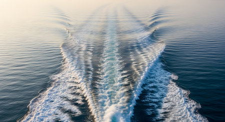Flow showing deep blue ocean water with a prominent white foamy wake trailing behind a moving vessel creating intricate swirling patterns on the surface keywords:...
