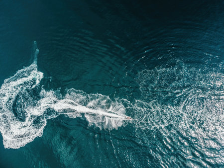 An aerial perspective captures a boat navigating across the deep blue ocean, leaving white trails behind. The scene showcases a dynamic interplay of textures, with the smooth water contrasting with the textured wake. Suitable for illustrating concepts related to travel or transportation.