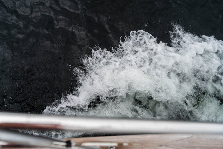 Close-up of the wake of a speedboat or ship, view from the stern of the boat, water, photography, full frame.